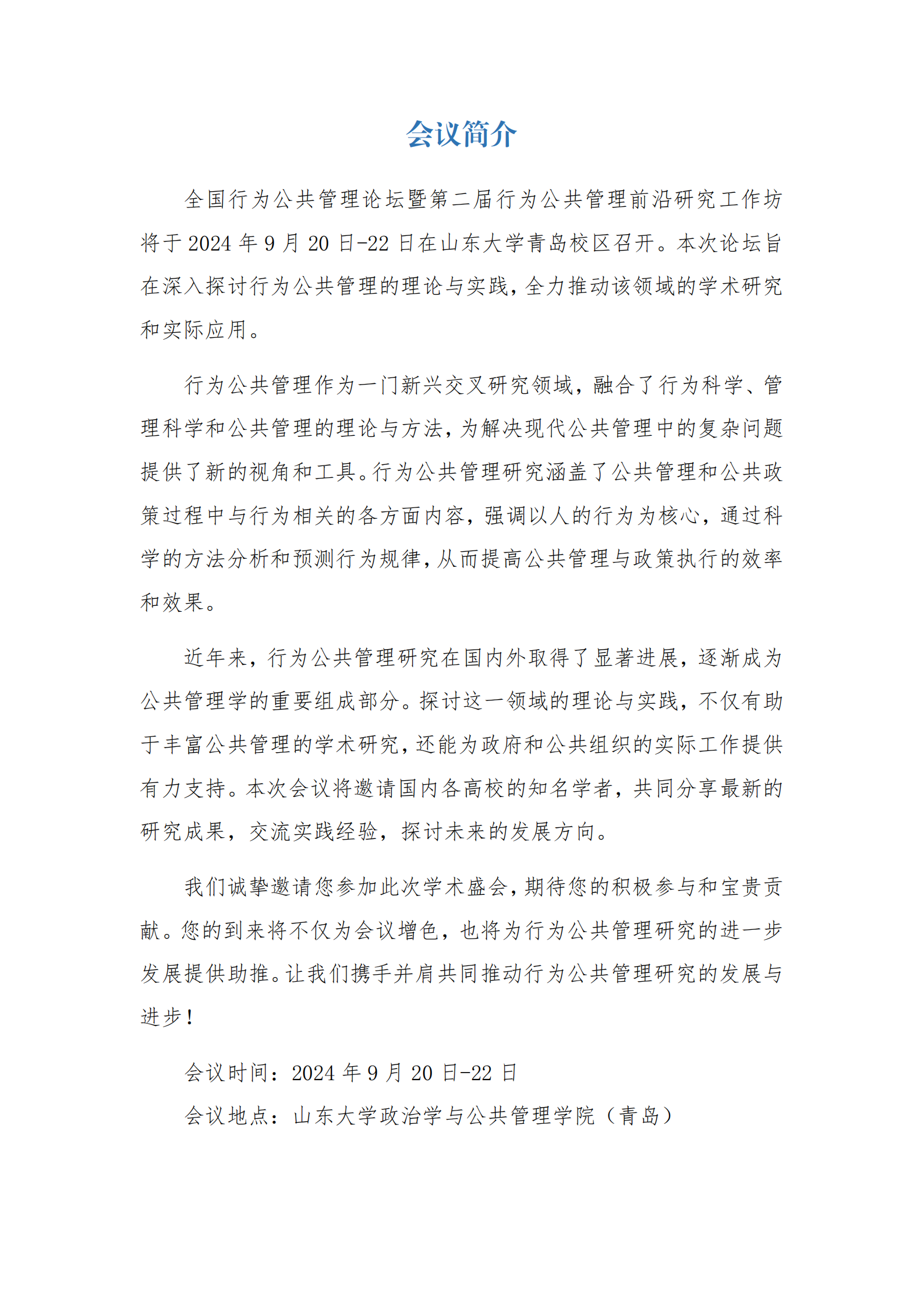全国行为公共管理论坛暨第二届行为公共管理前沿研究工作坊将于2024年9月20日-22日在TapTap青岛校区召开。本次论坛旨在深入探讨行为公共管理的理论与实践,全力推动该领域的学术研究和实际应用。