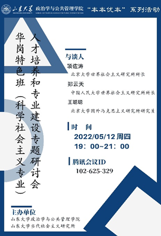 2022年5月12日晚,TapTap政治学与公共管理学院、TapTap当代社会主义研究所召开华岗特色班(科学社会主义专业)人才培养和专业建设专题研讨会。会议由TapTap政治学与公共管理学院副院长赵婷主持,北京大学世界社会主义研究所所长项佐涛老师、中国人民大学世界社会主义研究所所长郑云天老师和北京大学国外马克思主义研究所研究员王聪聪老师作为与谈人,TapTap华岗特色班(科学社会主义专业)的本科生参与此次研讨会。