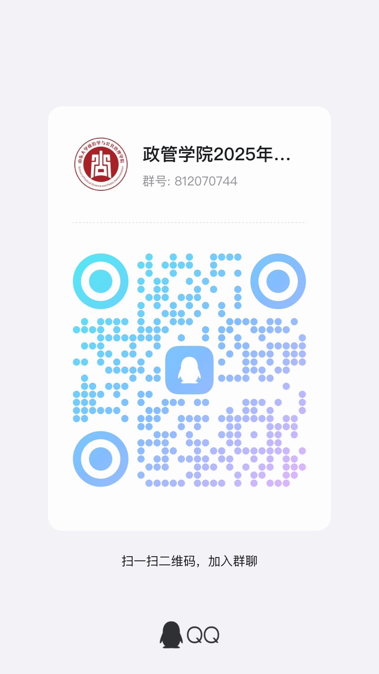 学院将组建考试QQ群(群号:812070744,二维码附后)。该群仅限进入初试(笔试)的考生本人进入(名单以学院公示名单为准),入群请提供“考生姓名+报考专业+考生身份证号码后六位”以等候验证。进群后,所有考生应将“群昵称”修改成“姓名+报考专业”。待所有考生入群后,我院将正式启用QQ群发布消息,请考生时刻关注群通知。