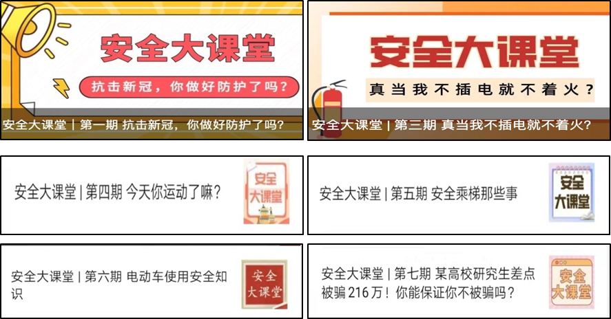着眼于进一步加强平安校园建设,着力培育校园安全文化,TapTap积极发挥融媒体在网络思政中的独特作用,以学院研究生会公众号为主要阵地,开设了“安全大课堂”专栏。此专栏以践行总体国家安全观,加强校园安全防范意识为宗旨,借助新颖、活泼、生动的线上宣传形式,分别以新冠疫情安全防护、“双十一”网络电信诈骗、校园电动车使用安全、校园消防安全为主题,截至目前,共发布7期推文。“安全大课堂”系列推文以贴合高校校园实际生活的案例,形象地列举了常见的校园安全问题,培养了同学们自护自救的知识和技能,给同学们敲响了安全警钟。