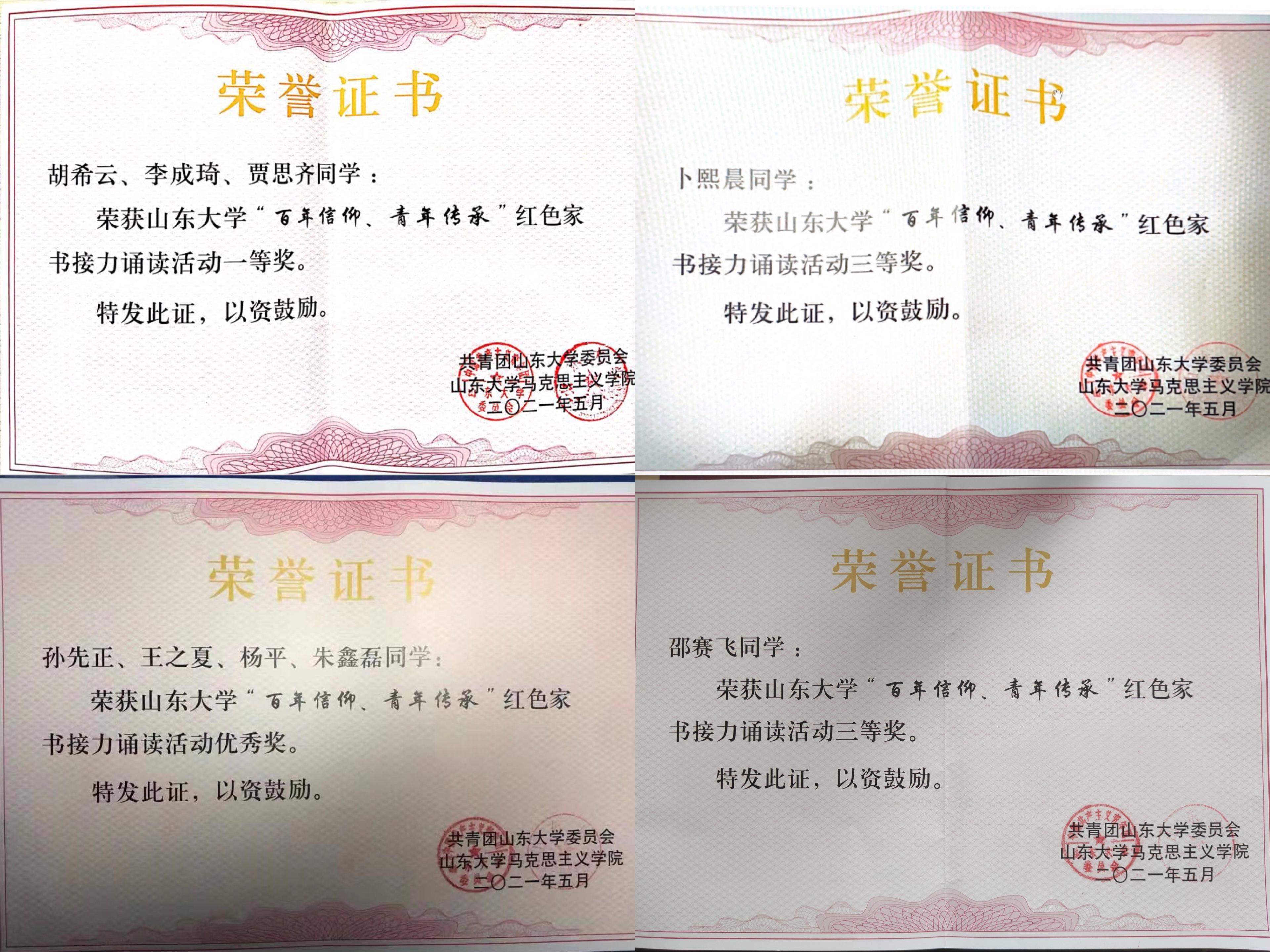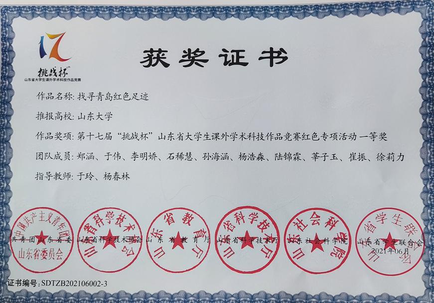 1、在第十七届挑战杯山东省大学生课外学术科技作品竞赛红色专项活动中,郑涵团队作品《找寻青岛红色足迹》获得山东省省级一等奖,全国二等奖;