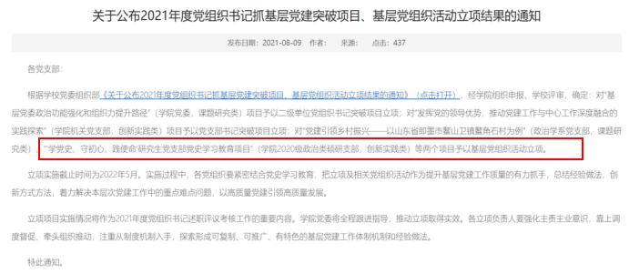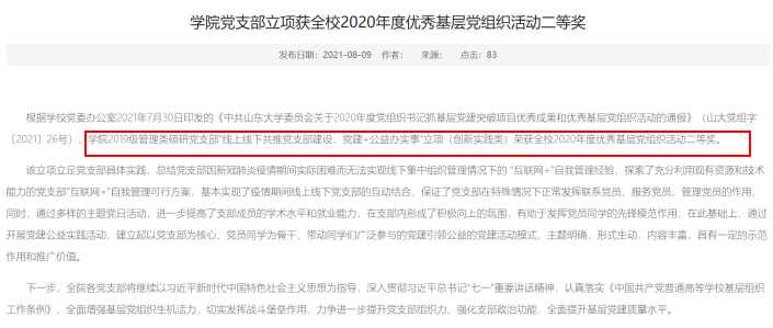 3、在2020年度党组织书记抓基层党建突破项目优秀成果和优秀基层党组织活动中,2019级管理类硕研党支部“线上线下共推党支部建设,党建+公益办实事”立项(创新实践类)获全校2020年度优秀基层党组织活动二等奖;在2021年度党组织书记抓基层党建突破项目优秀成果和优秀基层党组织活动立项中,2020级政治类硕研支部获基层党组织活动立项;