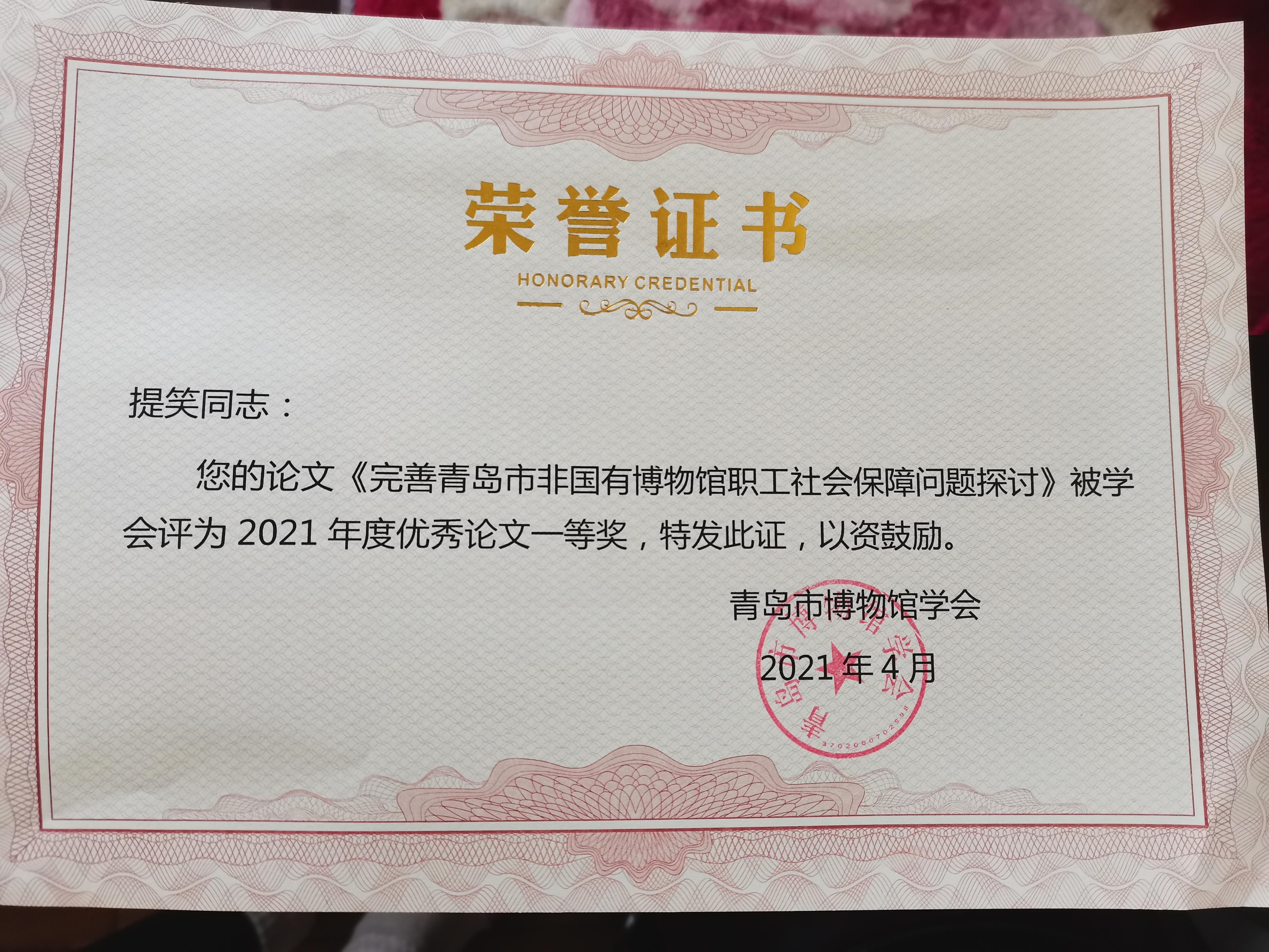 3.提笑撰写的《完善青岛市非国有博物馆职工社会保障问题探讨》获得青岛市博物馆学会2021年度优秀论文一等奖。