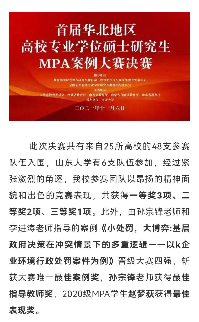 1、董峰、徐静冉撰写的《被“放任”的群租房乱象:街头官僚的选择性执法与注意力分配逻辑》获得山东省教育厅研究生优秀成果奖一等奖;边琦撰写的《危机管理中的符号与仪式:以新冠疫情防控为例》获得山东省教育厅研究生优秀成果奖二等奖;