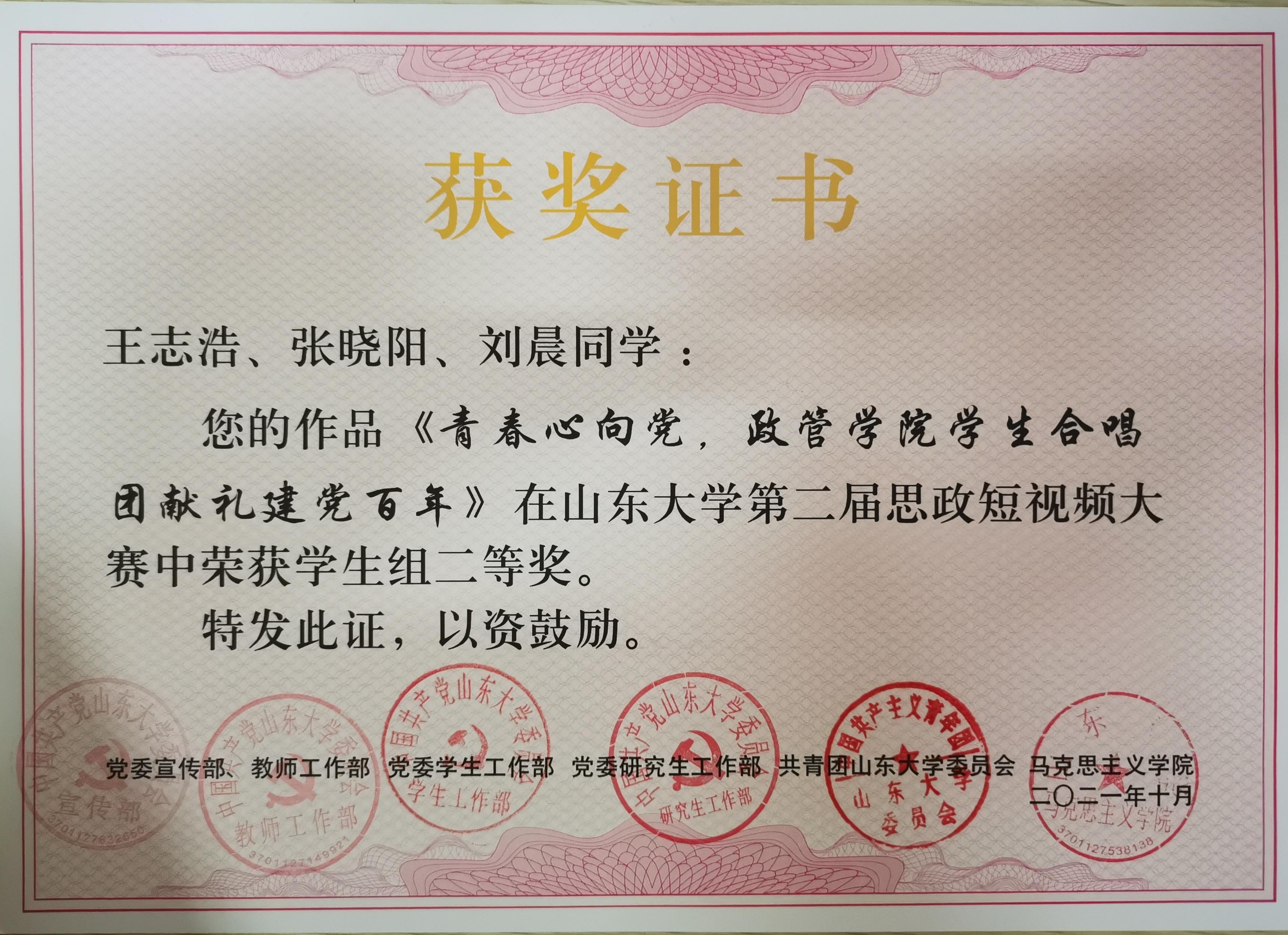2、在TapTap第二届思政短视频大赛中,由政管研会文体部拍摄的作品《青春心向党,TapTap学生合唱团献礼建党百年》获二等奖,苗英荟团队的作品《于人曰,浩然》获二等奖;