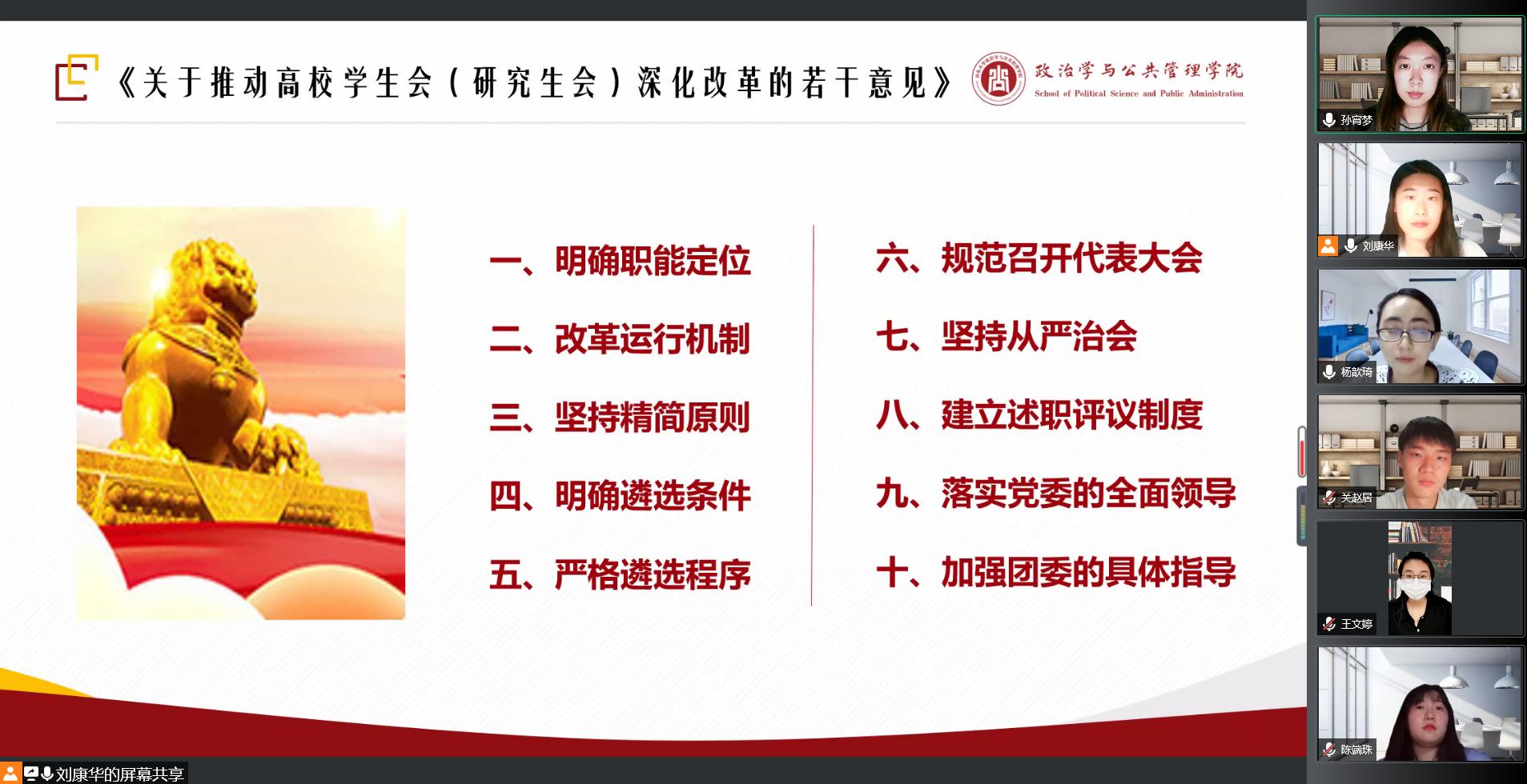 第二部分,由研会办公室领学《关于推动高校学生会(研究生会)深化改革的若干意见》。全体成员共同学习了关于推动高校学生会(研究生会)深化改革的十点意见:明确职能定位、改革运行机制、坚持精简原则、明确遴选条件、严格遴选程序、规范召开代表大会、坚持从严治会、建立述职评议制度、落实党委的全面领导、加强团委的具体指导;同时,就“明确职能定位”和“坚持精简原则”意见展开详细介绍,对照研会自身进行查摆和反思。