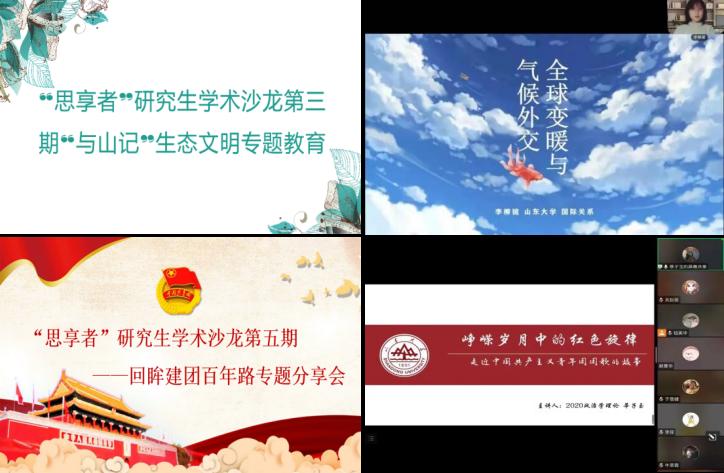 “思享者”研究生学术沙龙是由研究生担任主讲人的学术活动,旨在为学院研究生提供分享、交流和表达的平台。本学期共举办四次活动,分别围绕生态文明建设、建团百年等主题展开,四次活动共吸引四百余人次参与打卡,以进一步激励青年学生认真学习和贯彻习近平新时代中国特色社会主义思想,厚植爱党、爱国、爱社会主义的情感,让红色基因、革命薪火代代传承。