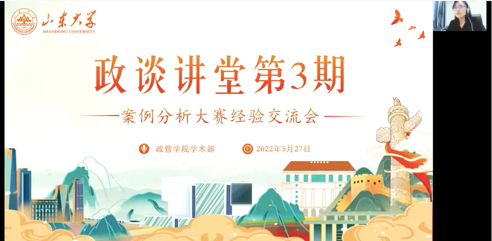 5月27日晚,政治学与公共管理学院2022年政谈讲堂第3期——“案例分析大赛经验交流会”于线上成功举办。本次讲座由学院学生会学术部承办,学院常务副院长马奔出席讲座并发表点评,清华大学中国公共政策案例分析大赛一等奖获得者徐雅静、付晓彤出席并担任主讲嘉宾。讲座由学院团委书记于玲主持。