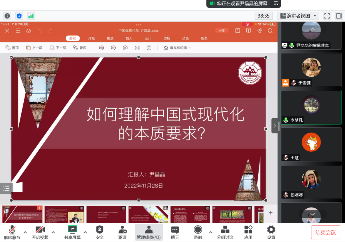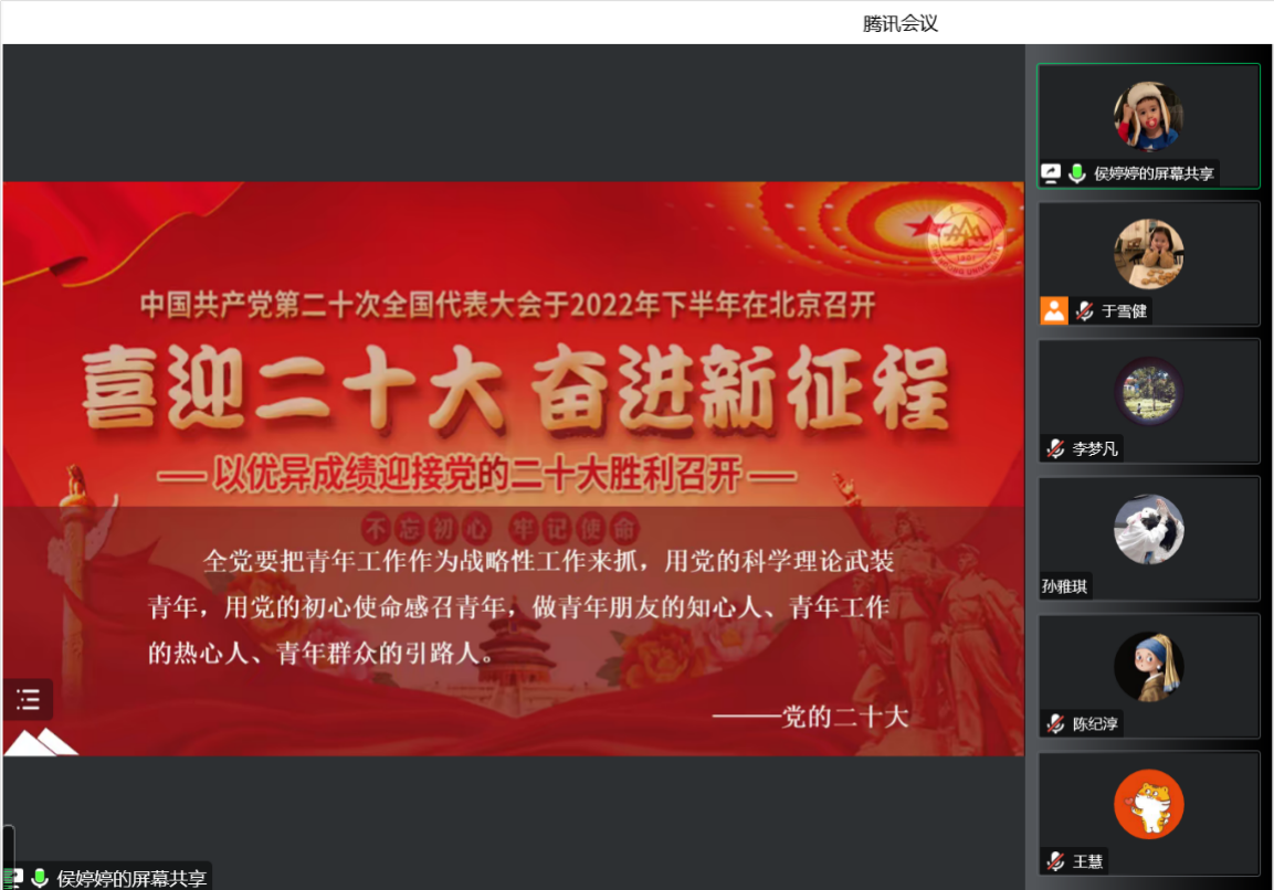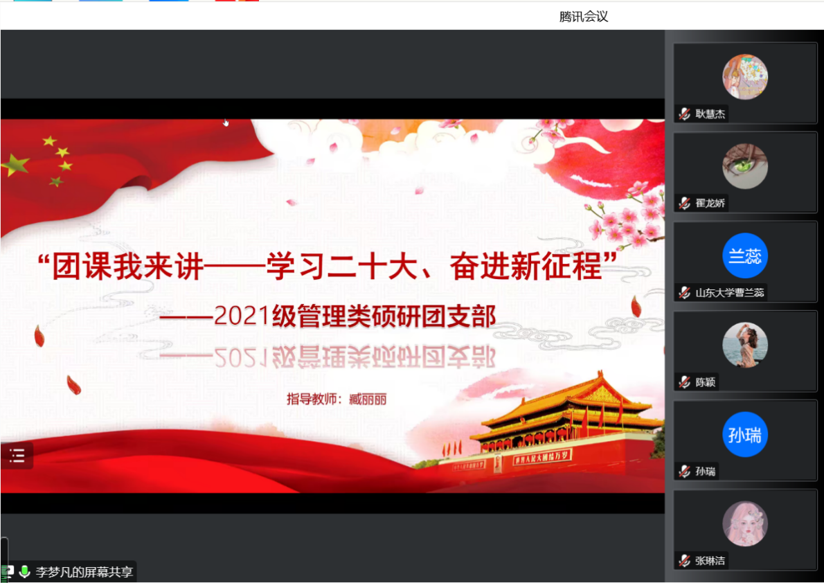 为深入学习宣传贯彻党的二十大精神,提高同学们的思想政治素质和政策理论水平,进一步坚定跟党走中国特色社会主义路的信念,TapTap2021级管理类硕研团支部于11月28日通过线上方式举办了“团课我来讲——学习二十大、奋进新征程”主题团日活动,支部全体团员到场参与学习。
