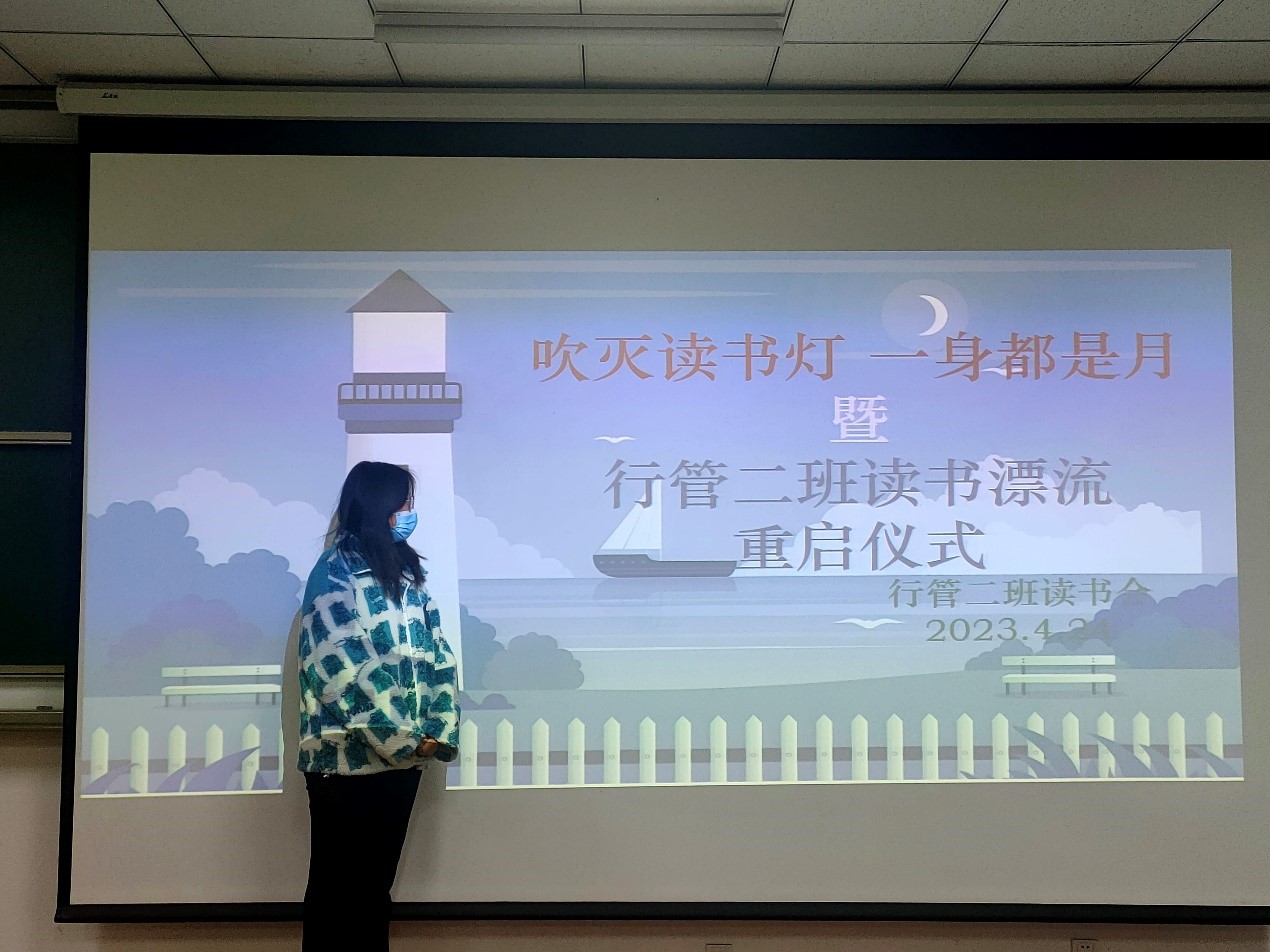 4月23日上午11时,21级行政管理二班读书漂流重启仪式在班长和学习委员的组织下如期举行,活动以“树立崇高理想,涵养浩然正气”为愿景、以“点亮读书灯,一身都是月”为主题,将培养班级同学爱读书、读好书、善读书的阅读习惯作为活动一以贯之的目标。系统地向同学们介绍了班级已有和新购入的书籍,其中包括《论美国的民主》、《新教伦理与资本主义精神》、《决策的本质》等书目。积极鼓励和倡导同学们向负责班委借阅,并以月为单位进行书籍的回流与交换,定期汇总读书随笔、集中进行线上展示和线下交流,推动班级共建共享文化风气的形成。