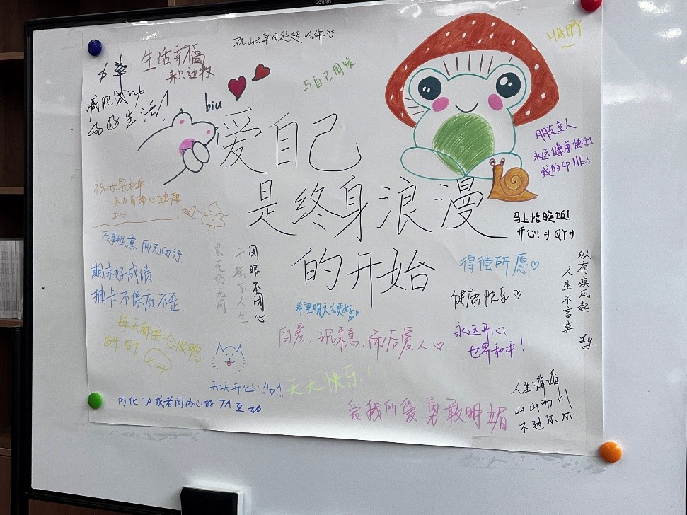 最后,活动还准备了“青蛙跳水”、“心情盲盒”、“心愿涂鸦”的互动环节,大家纷纷踊跃参与,分享了自己的快乐和烦恼,由王之夏老师为大家答疑解惑,并寄语同学们“爱自己,是终身浪漫的开始”。