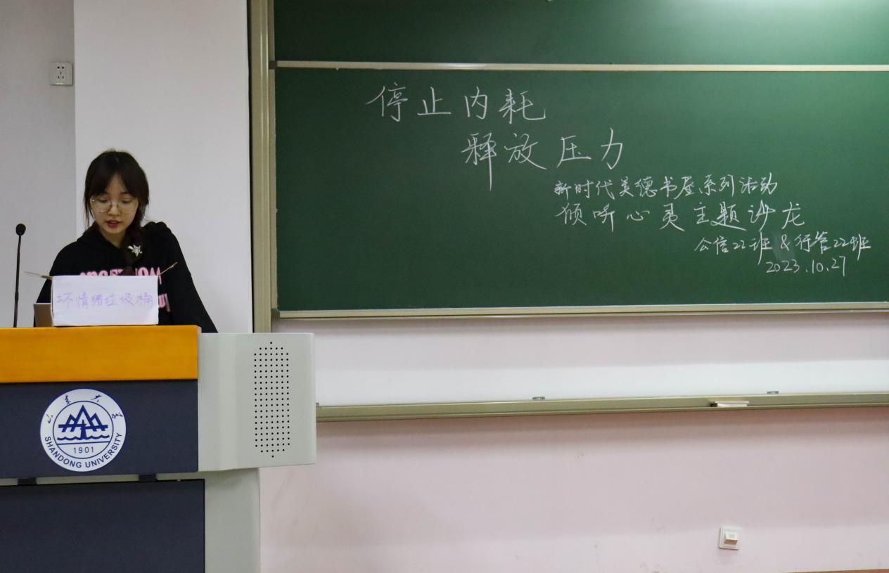 2023年10月27日,政治学与公共管理学院22级公信班与行管班于振声苑共同举办以“停止内耗 释放压力”为主题的心理沙龙活动,本次沙龙活动由公信班心理委员陈如意与行管班心理委员钟灵毓秀共同主持。