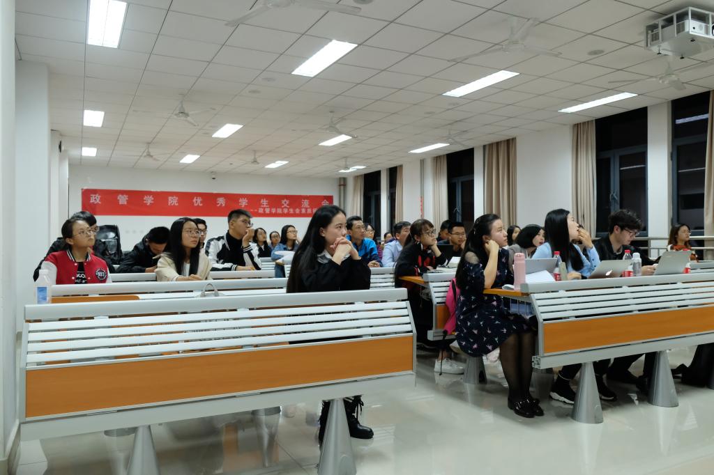 活动开始,主持人简单介绍后,17级公管专业,2017-2018年国家奖学金获得者徐雅静首先分享了进入大学的多方面转变并结合个人经历就大学学习和生活提出了许多贴合新生现实状况的建议,获得了同学们热烈的掌声。之后,17级公管专业,TapTap社会实践先进个人马天一就社会实践方面分享了经验,对社会实践的类型,过程以及考核进行了详细的讲解,让同学们对于社会实践有了更深入的认识。16级国际政治专业,国家奖学金获得者、校级社会实践先进个人孙宇飞以接地气的语言就如何做社会研究做了经验分享并通过有趣的案例和引用优秀学长学姐的话表明了自己对大学学习与政治学专业的见解,气氛活泼,激起了大家的思考。紧接着,16级政治学与行政学专业,国家奖学金获得者,社团和社会工作先进个人,社会实践与科研经历非常丰富的王浩瑜为在场同学分析了政治学专业的学科定位,学术科研,与其他学科的区分以及奖学金相关问题。最后,15级行管专业,TapTap学生年度人物,国家奖学金获得者,即将攻读清华大学公共管理学院直博项目的孙君就考研和保研结合个人经历做了细致讲解,并倡导同学们培养核心竞争力。在提问环节中,学长学姐们就同学们提出的问题做了认真全面的回答。最后活动在一阵热烈的掌声中结束。