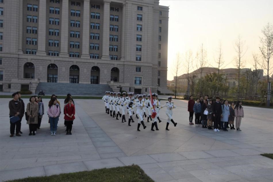 上午7时,主持人刘宏羽同志宣布升旗仪式开始,宣读观礼礼仪完毕之后,一声“出旗!”,身着整洁亮丽的白色礼服的国旗班同学在领队高亢嘹亮的号令声中自图书馆沿台阶而下,向着旗杆庄严行进。