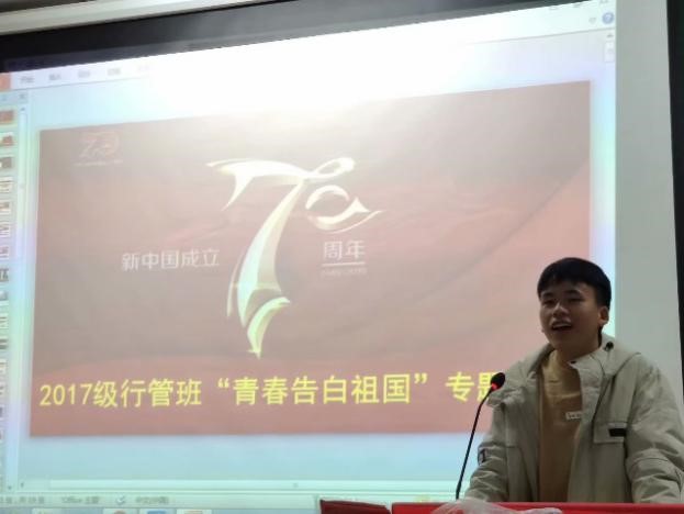 以青春之名,赴时代之约。青春之火,为祖国而燃烧;青年之路,因奋斗而精彩。莘莘学子,意气风发,豪情满怀,勇于探索,把人生追求与国家、社会的前途命运紧密联系在一起,让青春的节律与祖国脉搏同频共振,这样的告白方才最深切,这样的青春才最无悔。在中华人民共和国成立70周年之际,为响应学校号召,激励团员奋发向上的精神,2019年11月20日,17级行政管理班举办了“青春告白祖国”主题团日活动。活动围绕“了解党,铭记党,学习党”的中心展开,共分为四个部分进行。