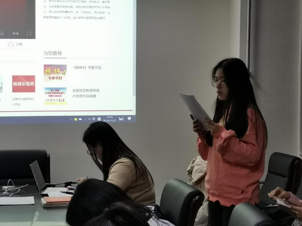 支部成员共同学习十九届四中全会公报,高洁馨,王亚丰以及杨柯林向大家分享了学习心得,大家共同学习交流后一致认为,中国特色社会主义制度和国家治理体系是经过长期实践检验的符合中国国情的正确选择,我们要紧密联系实际,保持奋斗姿态,强化责任担当,在学习和工作中承担起自己的责任,发挥模范作用。