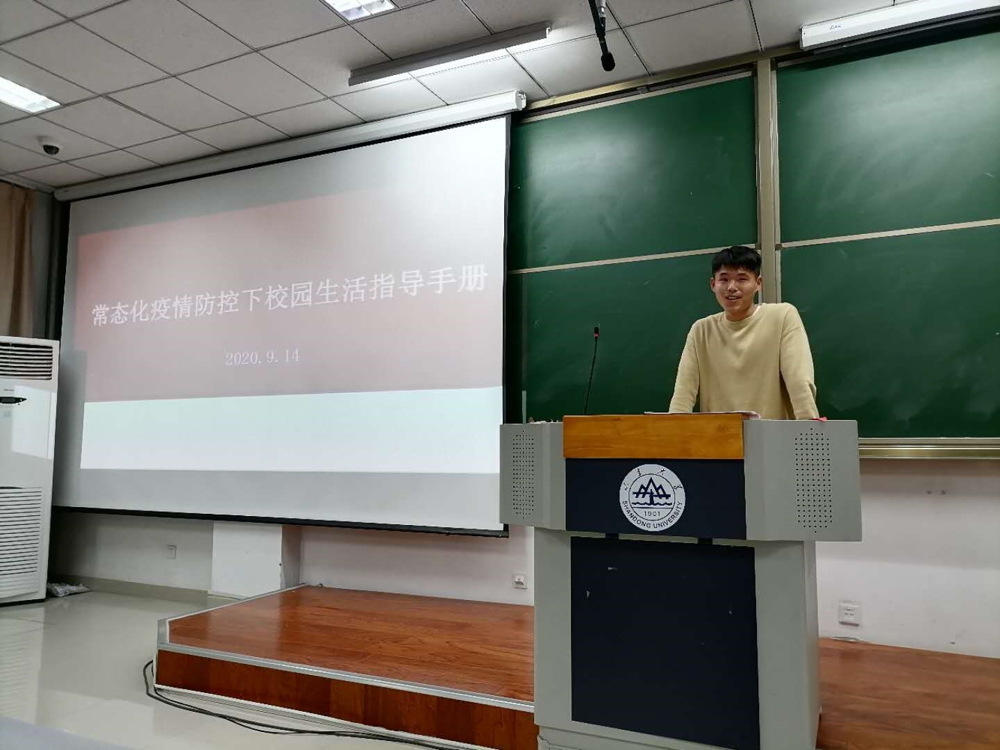 学院2020级研究生辅导员助理孙先正从安全稳定、班级管理、学生违纪处分实施细则、奖助体系四个方面介绍了与大家密切相关的学校管理制度和注意事项。他提醒大家既要保证自身健康安全、严格遵守学生管理规定,又要了解三助一辅等奖助体系,针对性地发展提高自己。
