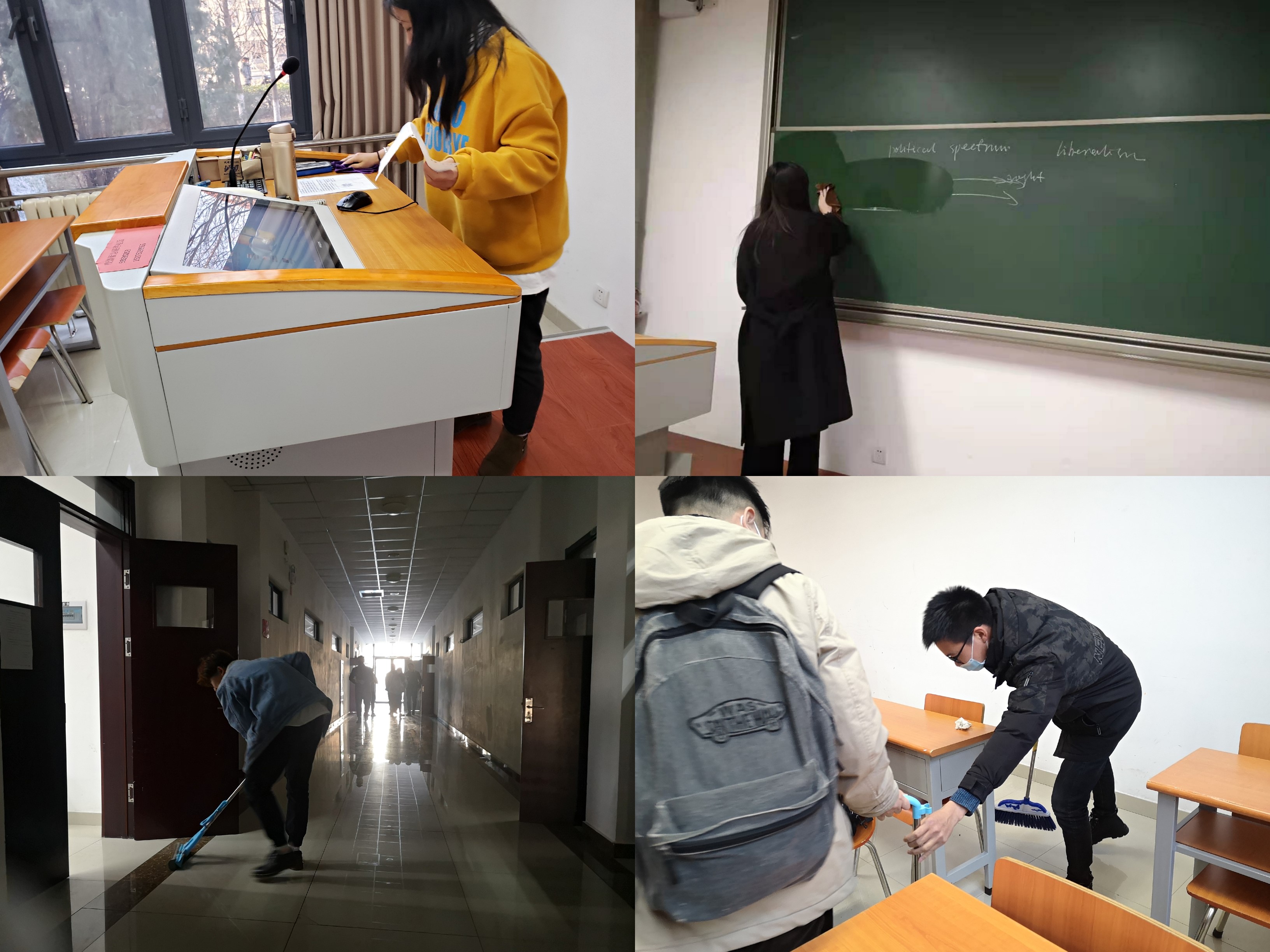 甘于奉献,助人为乐。18级政科班成员在安排好自身事务的前提下,积极争做雷锋同志口中“世界上最光荣的事----劳动”。在课前,同学们主动清理讲桌,摆放教学用具,帮助老师进行课件拷贝以及多媒体设备的调试;在课后,同学们积极参与多个教室与楼道卫生打扫,获得教学楼工作人员的一致好评。