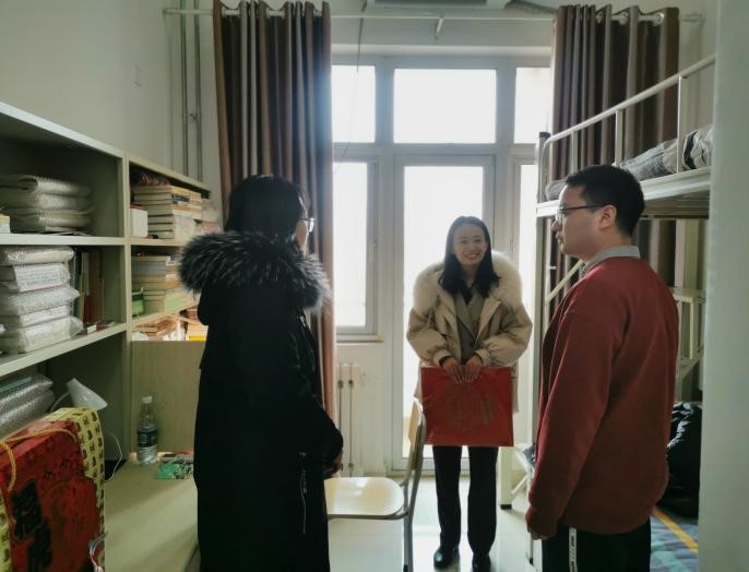 1月31日上午,正值除夕佳节,政治学与公共管理学院副院长赵婷、辅导员于玲走进学生宿舍,看望寒假留校学生,转达学校、学院对留校学生的关怀,深入了解同学们在学习、科研与寒假生活等方面的情况,并代表学院送上新春祝福与节日礼包。