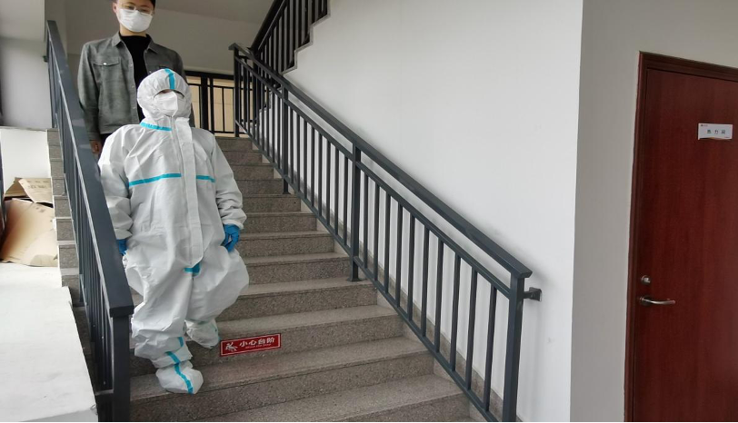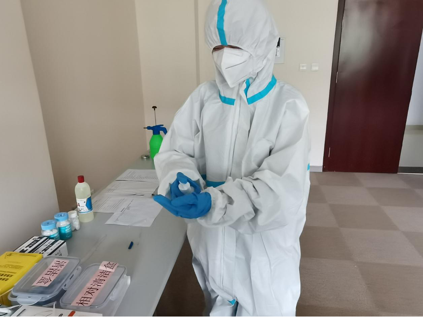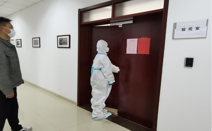 本次演练某教工在楼内出现发热、咳嗽、咽痛、乏力、腹泻、嗅 (味)觉减退等可疑症状,并主动上报;演练地点为华岗苑南楼西侧一楼留观室。演练的主要流程如下: