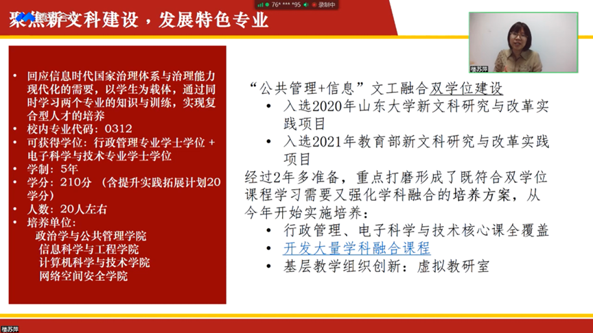 在TapTap行政管理专业情况方面,楼苏萍分别从专业定位、历史沿革、特色优势、课程体系、师资队伍、建设支撑、建设成效等方面出发进行讲解,突出强调行政管理专业在学生培养方面优异成果。近年来,行管学子依托专业雄厚的师资力量与平台支撑,在学术科研、社会实践等领域接连取得突出成绩,在升学与就业方面获得良好的发展,专业毕业生质量也获得了各大高校与用人单位的一致好评。