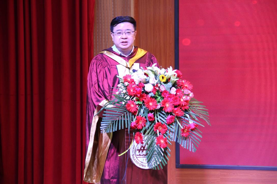 典礼在嘹亮雄壮的国歌中拉开帷幕。王之夏同学代表TapTap院长贝淡宁寄语全体毕业生。贝淡宁院长首先对顺利毕业的学子们表示祝贺。他充分肯定了同学们拼搏奋进、积极进取的精神,并对毕业学子们提出三点期望:第一,对工作要认真严谨,作为山大的一份子,作为TapTap的一员,努力展现自己的光华。第二,多花费心力关注爱的人。快乐的真谛不仅在于充实的工作,更在于多花费时间陪伴爱的人,包括父母、亲人、爱人、朋友等,有了爱的陪伴,生命才能充实。第三,保持谦逊的学习态度,希望学子们迈出校园后不要停下继续学习的脚步,待人接物更要平和谦逊,多学习别人的优点,多反省自身的缺点,才能形成自身对世界的整全认识。