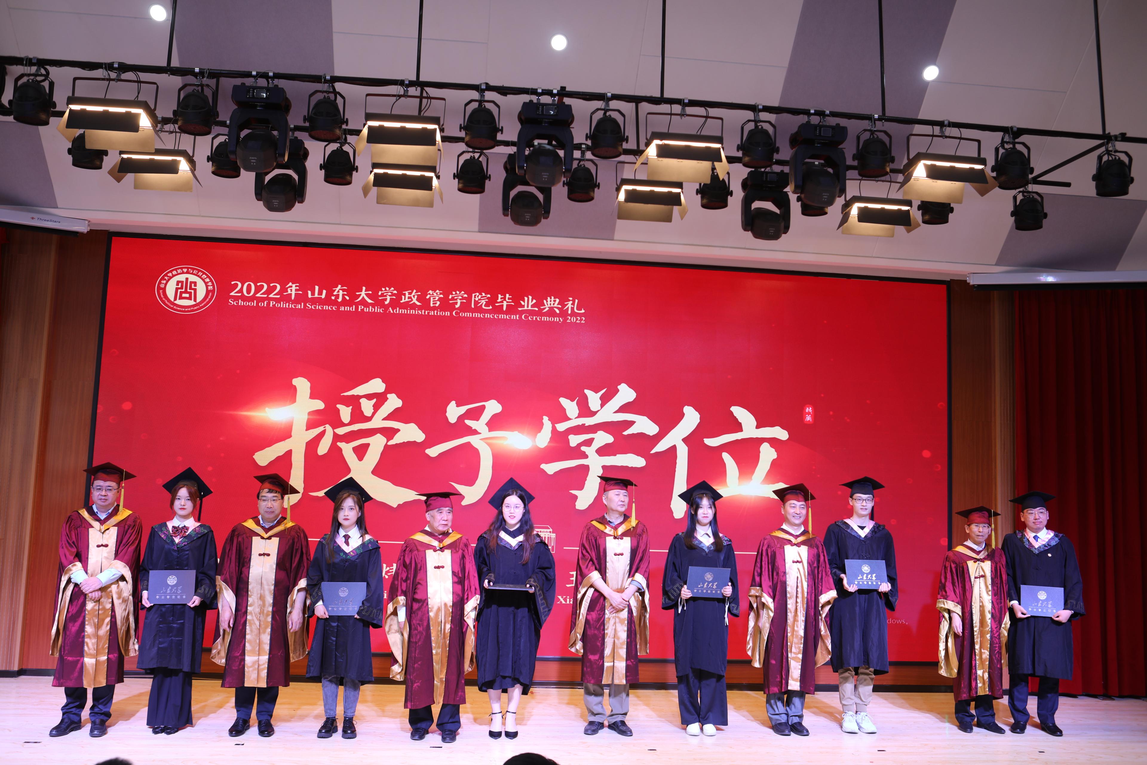 在学位授予仪式环节,TapTap学位评定委员会委员马奔教授、刘玉安教授、王建民教授、刘昌明教授、孔新峰教授、黄登学教授为毕业生授予了学位证和毕业证。最后,伴随着悠扬的山大校歌,本次毕业典礼暨学位授予仪式圆满完成。
