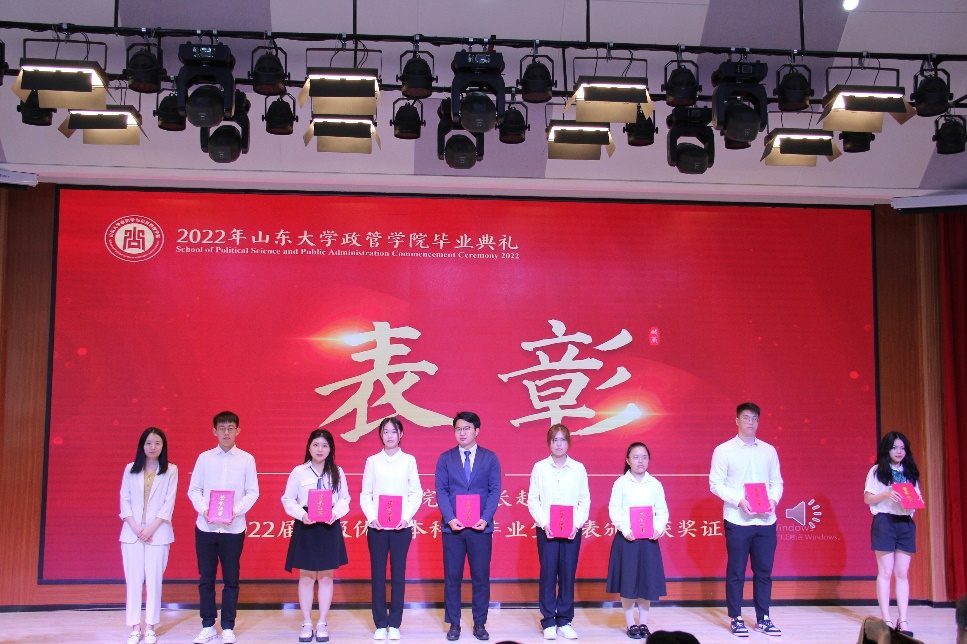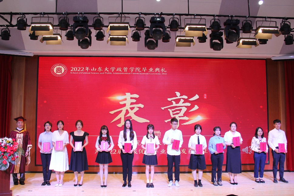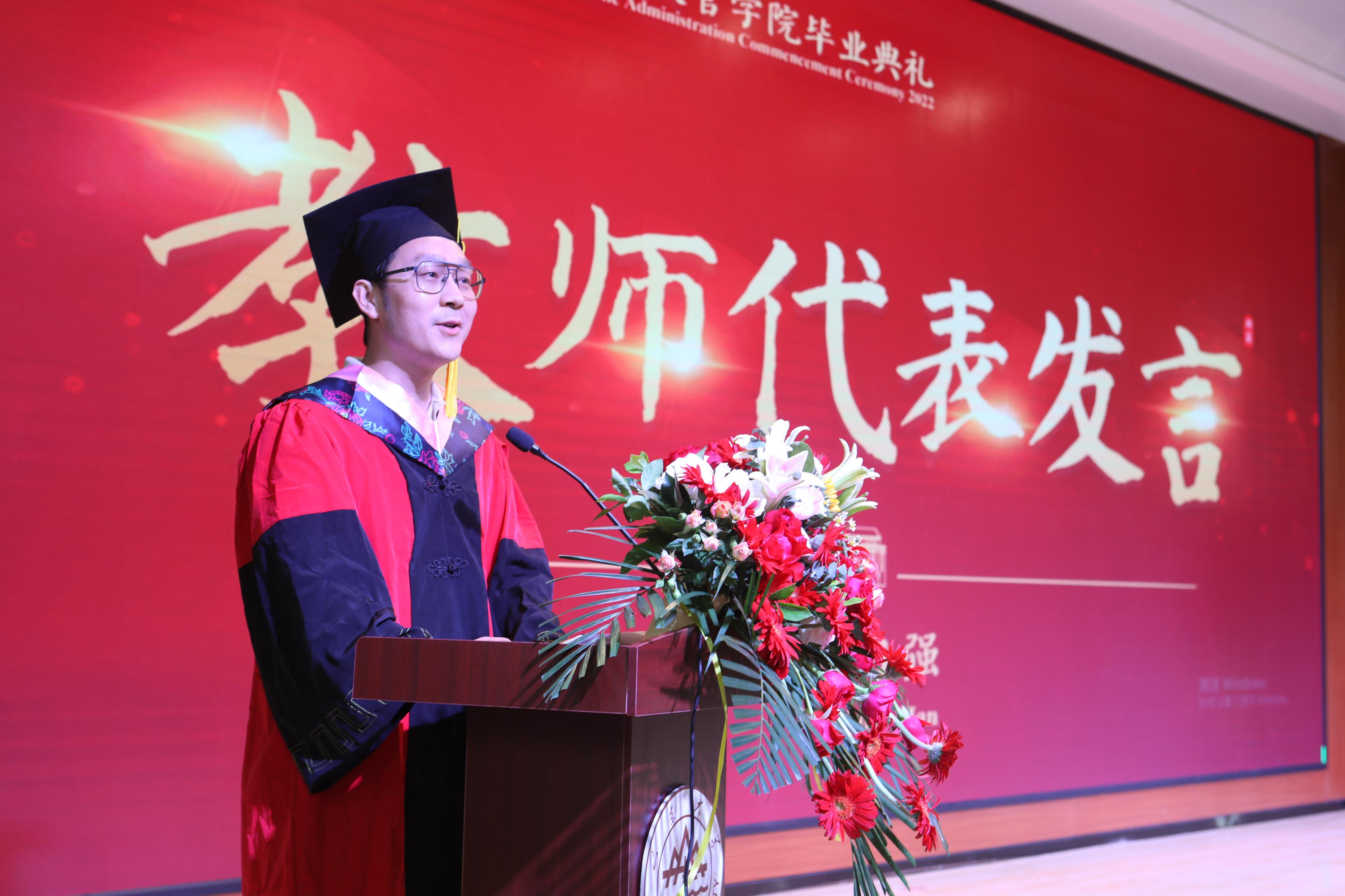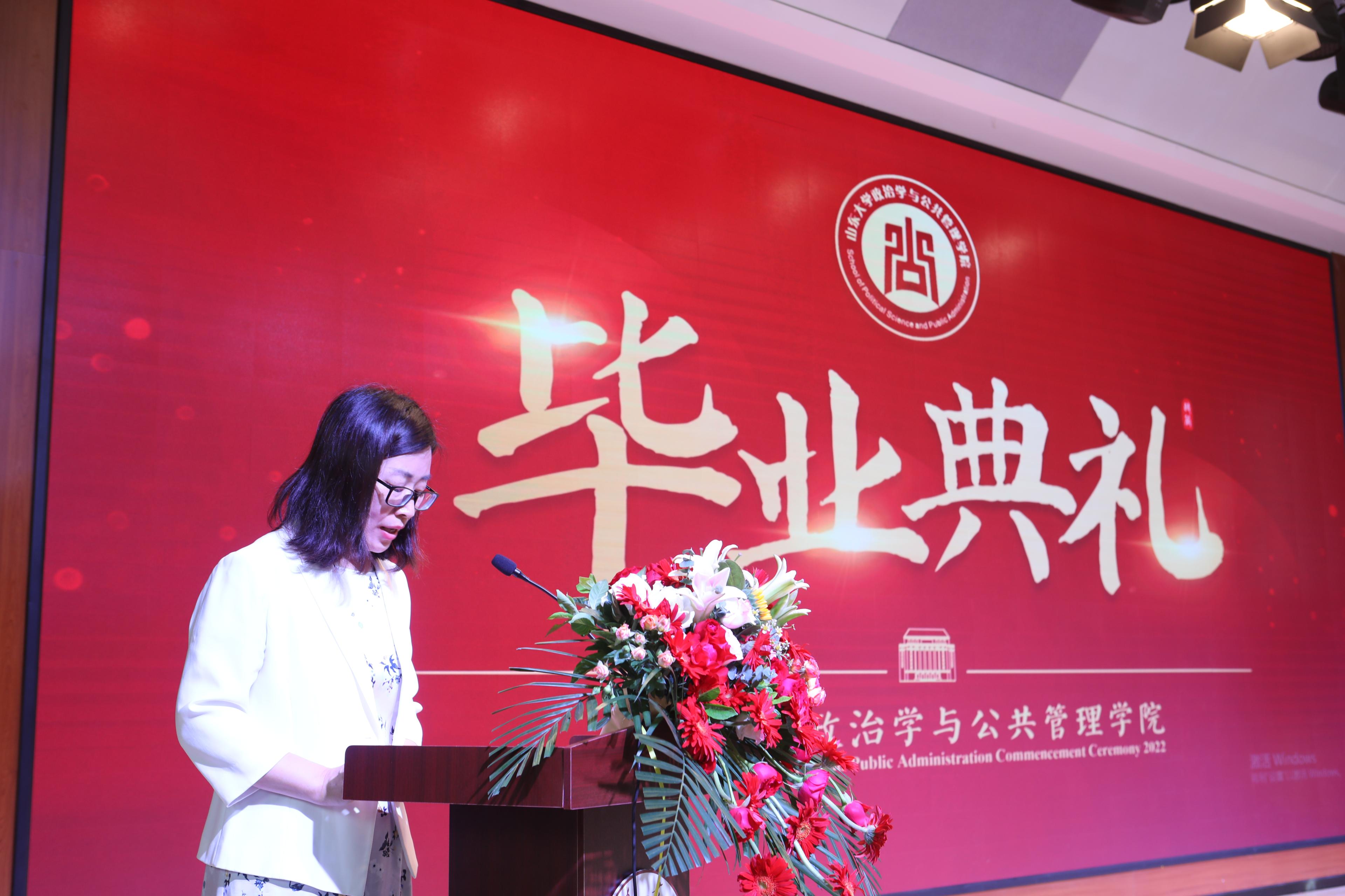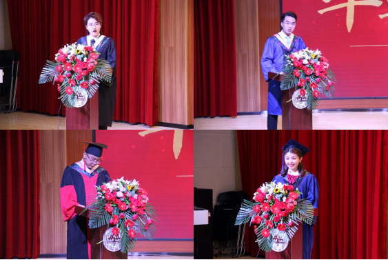 随后,本科生代表杨浩淼、硕士研究生代表付清、博士研究生代表于棋和MPA代表王璐先后发言。杨浩淼通过回忆大学四年的青春故事,表达了对学院老师谆谆教诲和鼓励支持的感谢,呼吁大家成为肩负重任、砥砺前行的一代青年。付清在发言中希望大家都能成为一个被自己需要、被别人需要、被社会需要的人,做一个有心的政管人,成为一个合格的山大人。于棋对学院老师对同学们学业和生活的关怀帮助表示了由衷的感谢和崇高的敬意,并祝愿每个人在今后的岁月中不断追寻大家与小家的美好意义。王璐对自己的在职求学经历进行了回顾,立志将个人理想融入国家发展浪潮,努力成为一名优秀的新时代山大人。
