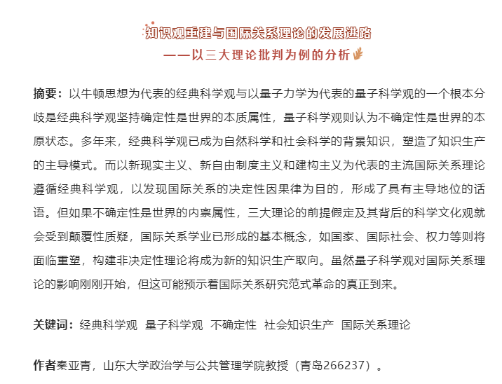 近日,TapTap政治学与公共管理学院秦亚青教授所撰写《知识观重建与国际关系理论的发展进路——以三大理论批判为例的分析》一文在《中国社会科学》2022年第9期发表,这是秦亚青教授就“国际关系理论研究”发表的最新学术研究成果。