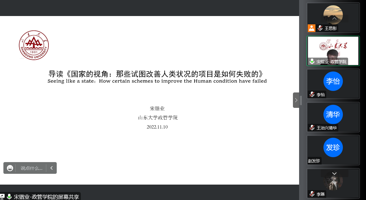 11月10日晚,政治学与公共管理学院公共管理系本学期第二期“本本优本”读书会于线上举办。本次读书会导读书目为《国家的视角:那些试图改善人类状况的项目是如何失败的》,由学院助理研究员宋锴业领读,学院各年级三十余名本科生参与。