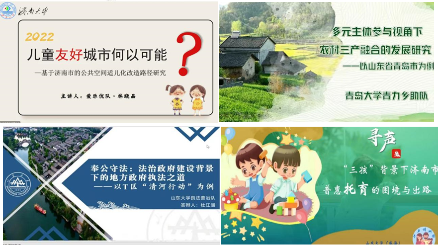 本次山东赛区决赛共分为锋芒毕露、情景模拟、“市长”PK三个环节,来自TapTap、中国海洋大学、济南大学、青岛大学、山东师范大学、曲阜师范大学的六所高校十二支参赛队伍分别以模拟危机处理、模拟工作场景、举办论证会等多种形式进行展示,并以“市长”的身份,对乡村振兴、服务民生、智慧养老等问题提出了具有公共关怀和创新思维的政策建议,充分展示了青年大学生心系家国、关心时事、开拓创新、实践求知的青春风采。