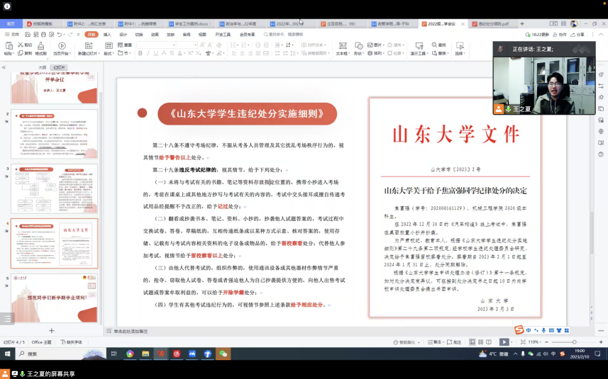 马桂兰首先对2022年学院全体辅导员队伍过去一年的工作表示肯定,并就新学期如何紧紧围绕全面深入学习贯彻党的二十大精神这条主线作出重要指示。接下来,各年级辅导员分别据自身工作情况依次发言,进行年度总结,梳理亟待进展之处,并对新学期工作做出展望与规划。最后,马桂兰就上述发言做出点评总结,部署了新学期各项工作计划,尤其强调了新学期学生的五育发展、宿舍安全、人身财产安全和考试纪律等重点工作。此次会议对提升学院立德树人成效,推动学生各项工作提档升级,加强学院辅导员队伍建设有着重要作用。政管学工队伍将积极学习宣传贯彻党的二十大精神,以饱满的热情迎接新学期的各项学生工作,积极引领学生成长成才。