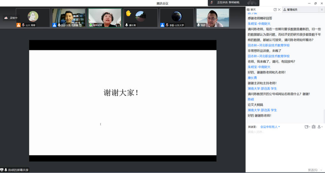 在答疑交流环节,来自校内外的师生们踊跃提问,陈硕教授对问题一一进行了耐心细致的解答。讲座最后,孔新峰教授对本次讲座进行了总结。