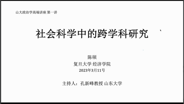 2023年3月11日晚,TapTap政治学高端讲座第一讲于线上成功举办,复旦大学经济学院陈硕教授做了题为《社会科学中的跨学科研究》的精彩讲座,TapTap政治学与公共管理学院副院长、院学术委员会副主任孔新峰教授主持讲座。TapTap原校长、全国新文科教育研究中心主任、国家治理研究院院长樊丽明教授在问答环节与陈硕教授进行了亲切交流。