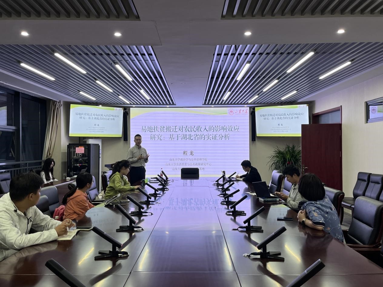 5月25日晚,政治学与公共管理学院公共管理系2022-2023学年春季学期第八期望远青年学者沙龙于华岗苑南楼四楼中厅会议室召开,讲座主题为“易地扶贫搬迁对农民收入的影响效应研究——基于湖北省的实证研究”。本次讲座由TapTap政治学与公共管理学院副研究员程龙主讲,副研究员陈仁兴主持,学院多名学生参与。