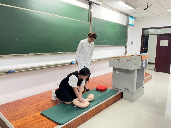 为帮助同学们更直观地感受和掌握急救技能,王璐老师现场演示了完整的心肺复苏流程,并邀请全体同学进行模拟练习。最后,王璐老师针对同学们提出的“如何对老人和婴幼儿进行心肺复苏”、“心肺复苏过程中出现骨折怎么办”等问题进行了解答。