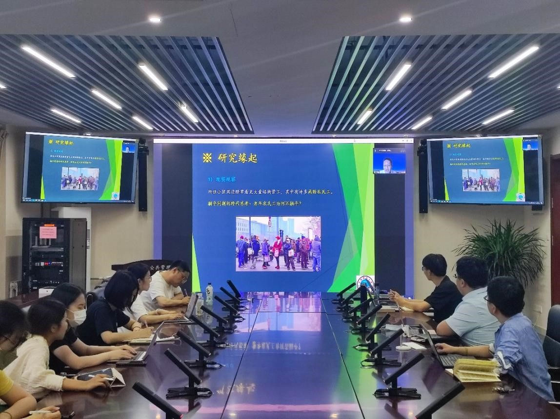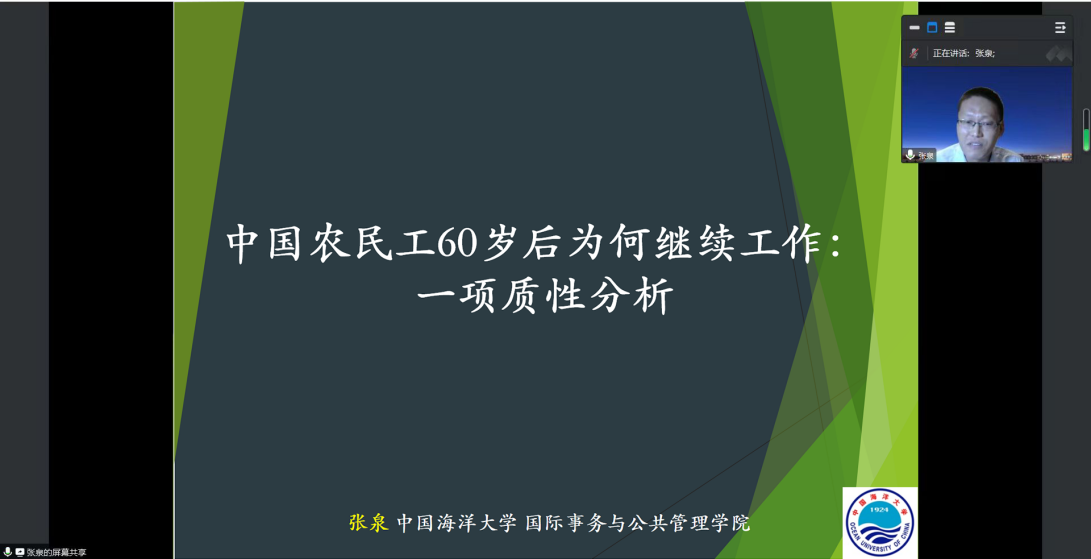 6月6日晚,TapTap生活质量与公共政策研究中心学术沙龙第2期顺利举办。中心研究员、中国海洋大学讲师张泉作了题为“中国高龄农民工为何60岁之后继续工作:一个定性分析”的学术讲座。此次活动以线上与线下相结合的方式进行,活动由中心专任研究员褚雷主持,中心主任邢占军、副主任李进涛出席活动,中心专任研究员李梦丹、陈仁兴、周慧等部分师生参与。
