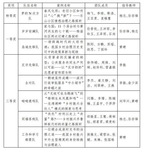 其中,由黄晴老师指导的《一场跨越时代的火炬传递:我国乡村治理历史变迁中的政策革新与延续》,斩获大赛唯一“最佳案例奖”,杨志老师荣获“最佳指导教师”称号,王泽雨同学荣获“最有价值队员奖”。