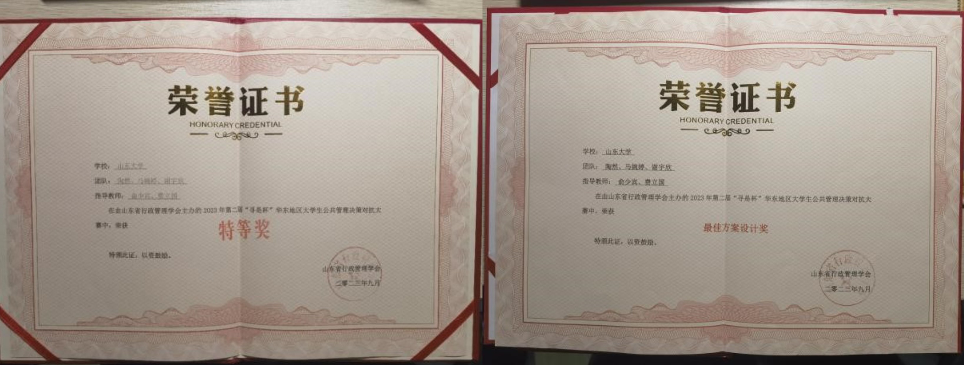 2023年9月23日至24日,政治学与公共管理学院学子赴济南参与第二届“寻是杯”华东地区大学生公共管理决策对抗大赛并获特等奖、最佳方案设计奖和优秀指导教师奖等多项荣誉,被推荐参与全国总决赛。