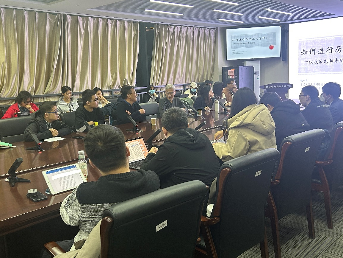 首先,姚中秋教授通过论述西式政治学理论的缺陷和历史政治学的价值对“为什么要做历史政治学的研究”进行了解释。其次,姚中秋教授从实践的角度出发,以士大夫和干部两种类型的能动者为例,论证了西式政治学理论中的官僚者无法准确描述中国现实中的能动者,深入探讨了如何进行历史政治学的研究。最后,姚中秋教授重申历史政治学的理论价值,主张未来研究应从官僚制范式转向士大夫-干部范式,从结构中心主义转向能动者中心主义。姚中秋教授对历史政治学的系统阐述对于构建中国自主知识体系具有积极的推动作用,受到与会师生的高度关注与认可。