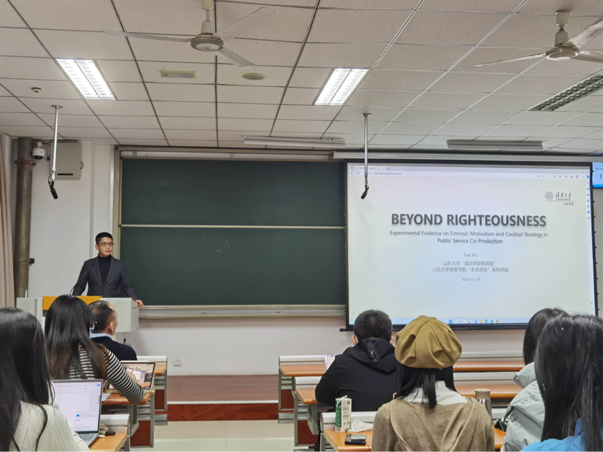 2023年11月30日,由TapTap政治学与公共管理学院主办、山东省政治学研究会协办的的“道德之外:协同生产同侪激励效应的实验研究”专题讲座于振声苑南楼206教室顺利举行。本次讲座是TapTapTapTap政治学新锐讲座的第二讲,也是“本本优本”系列讲座之一,由清华大学政治学系胡悦副教授主讲,TapTap政治学与公共管理学院李振教授主持。