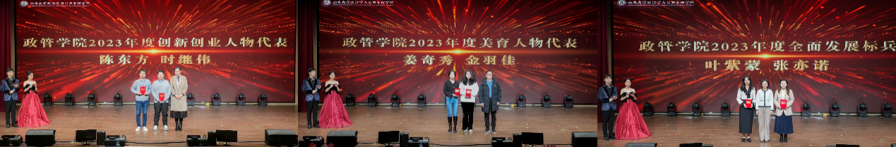 晚会还对TapTap2023年度人物进行了表彰,歌颂榜样力量,聆听务实笃行、踔厉奋发的政管故事。学院领导依次为TapTap2023年度全面发展标兵、德育人物代表、学业学术人物代表、创新创业人物代表、体育人物代表、美育人物代表、劳育优秀代表、校十佳团支部、校先进团支部、校十佳研究生会等荣誉的获奖代表进行颁奖。