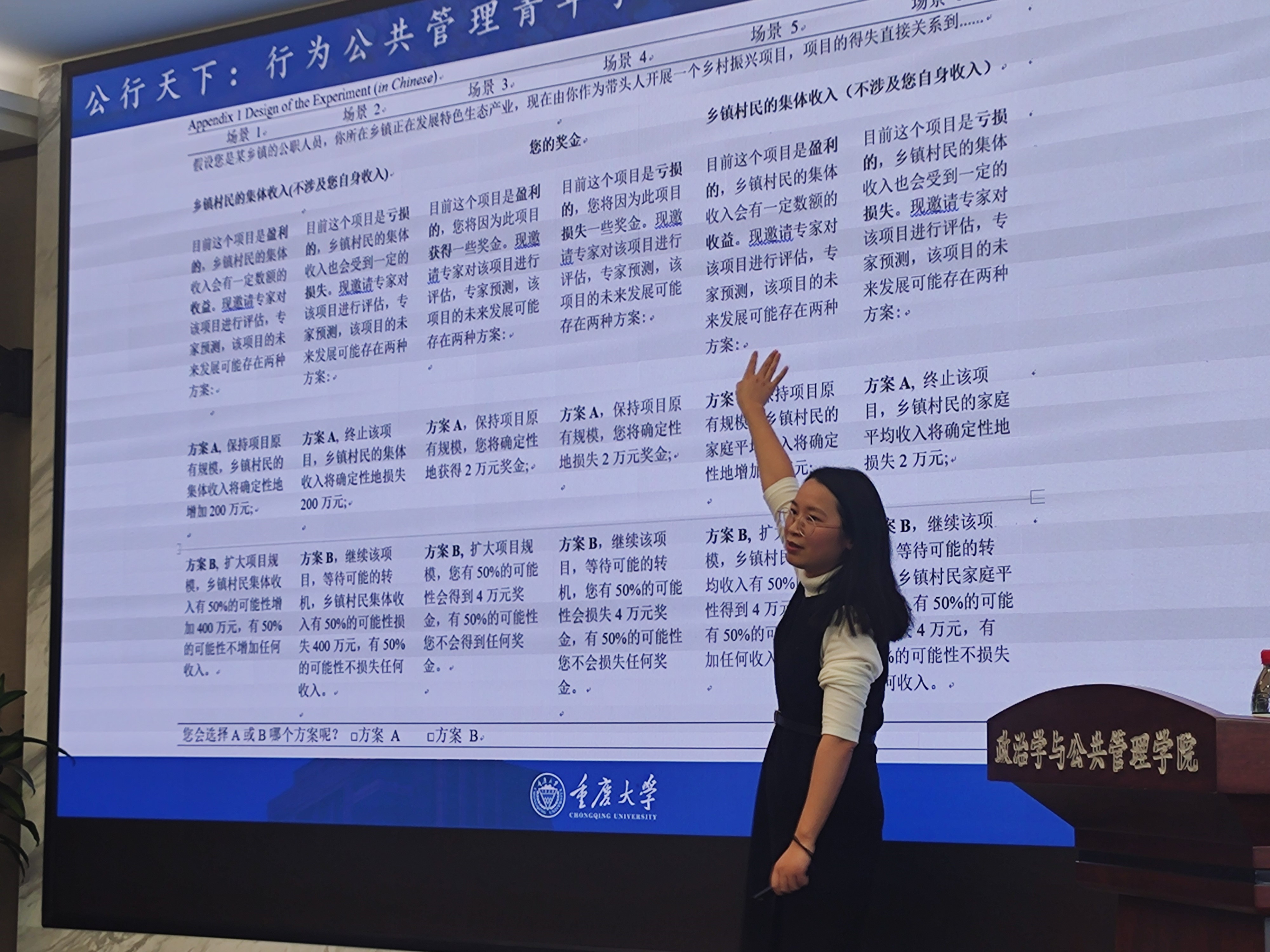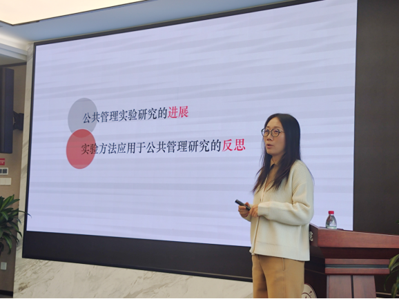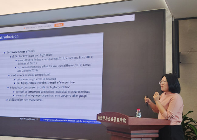 助推理论的应用研究也在本次论坛中得到展现,如重庆大学张金凤老师在“公务员决策风险偏好的框架效应研究”为题的会议报告中,区分了目标、得失、特征等框架的异同,并深入探究语言表达对农民行为的影响,充分展示了干预材料如何精准体现研究框架。华中科技大学李晓倩老师就如何兼顾外部“可信”与内部“可靠”问题,进行了“实验方法在公共管理研究中的应用:进展与反思”为题的报告,指出实验研究要保证样本的随机、情境的多样、数据类型的明确外,还要注意实验伦理,从而增强研究的可复制性和结果解读有效性。湖南大学刘盼老师“化压力为动力:工作压力对基层公务员变革担当行为的影响机制探讨”的报告,聚焦了“变革中的现实环境”和“压力下的消极不作为”问题,着重分析变革担当行为、工作压力、印象管理、公共服务动机等变量间的作用关系,并提出相应的职责设置、岗位评估、思想教育等对策建议。此外,TapTap王乙杰老师作了题为“Intergroup social comparison feedback and the heterogeneous treatment effects:a survey experiment to reduce water consumption”的报告,主要研究组间比较信息对居民节水意愿的影响,发现在提供组间比较信息时居民节约用水意愿明显提高,还分析了用水习惯和干预信息的强度对干预结果的调节作用。