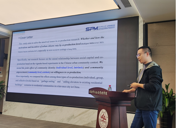 华东政法大学杨帆老师作了题为“饱食思报:争议性应急监管处罚的社会回应研究——一项调查实验”报告,认为在更深层的政民互动问题上,当前有关民众策略性反馈、组织潜力、监管感知、执法合法性的研究方法、框架和要素的分析还需持续探索。华东师范大学范洋洋老师结合长期在社区的观察,进行了“Residents’ community identity, community empowerment, and willingness to co-production: Evidence from a survey experiment in China”为题的汇报,分析个体、小组和集体合供在中国场景下的表现和效果,在分析社区认同、社区赋权和合作意愿相互作用后建议相关部门加强信息公开和保证公众参与。最后,TapTap李爽老师题为“不同说服方式对公民健康饮食意愿的影响——一项跨文化研究”的报告,阐述了该助推在本土荷兰人和移民群体中的文化调节效应。