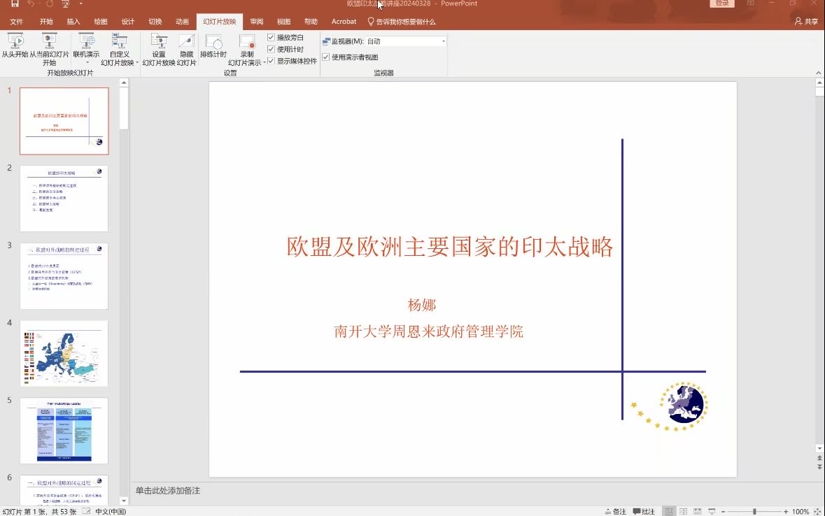 讲座伊始,杨娜教授首先详细介绍了欧盟对外战略的制定过程;其次,杨娜教授 具体分析了欧盟的东亚战略以及东南亚战略,并从安全层面、经济方面、社会领域梳理了欧盟与东南亚的关系现状;最后,杨娜教授重点讲解了欧盟的印太战略,她指出欧盟印太战略的核心内容主要包括以下三个方面:多维度深化经贸合作关系;应对共同挑战,增进全球治理议程影响力;扩大防务安全合作,强化印太地区军事存在。