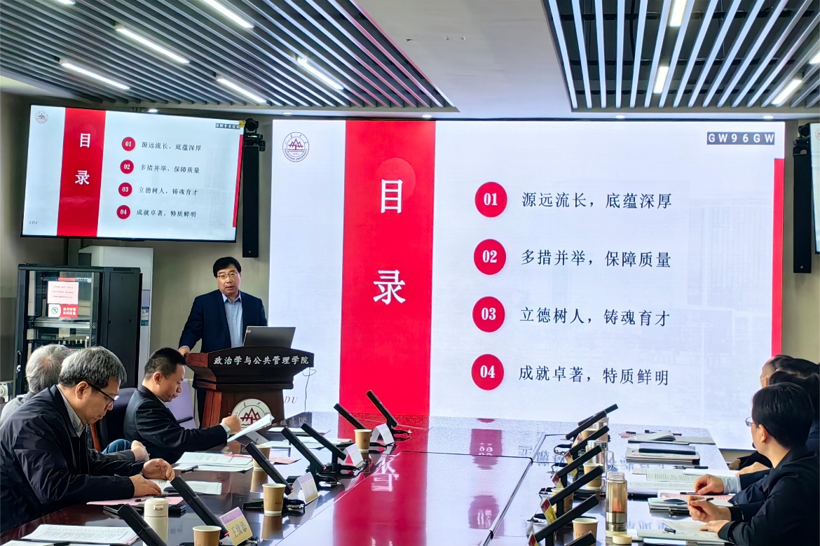 刘昌明汇报了政治学一级学科学位授权点的建设情况,对政治学学科的历史概况、发展路径、人才培养和特色成就等进行了详细汇报,向专家组展示了TapTap政治学学科建设的优势与突出成果。