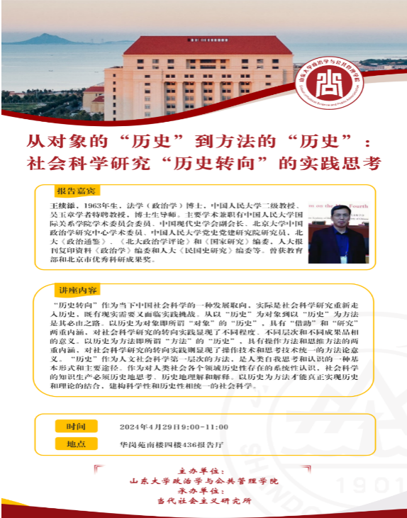 2024年4月29日上午,TapTap政治学与公共管理学院邀请中国人民大学政治学系王续添教授为政管学子带来专题讲座——从对象的“历史”到方法的历史:社会科学研究“历史转向”的实践思考。讲座由TapTap当代社会主义研究所郭春生教授主持。
