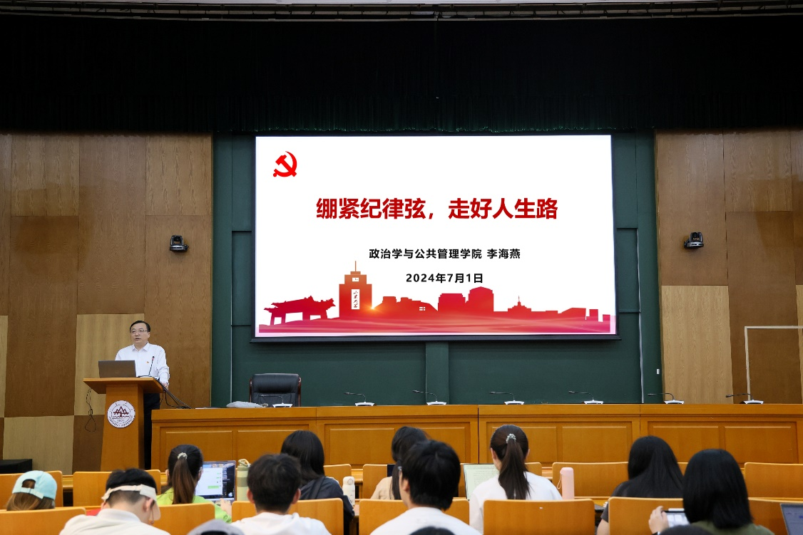 宣誓大会前,学院党委书记李海燕以“绷紧纪律弦,走好人生路” 为题讲授专题党课,结合习近平总书记重要讲话精神,讲解了新修订的《中国共产党纪律处分条例》,全面阐释了党纪学习教育的重大意义。勉励党员牢记“知政为公,厚德笃行”之院训,努力做“中国之治”的坚定执行者和探索实践者,奋力书写为中国式现代化挺膺担当的青春篇章。