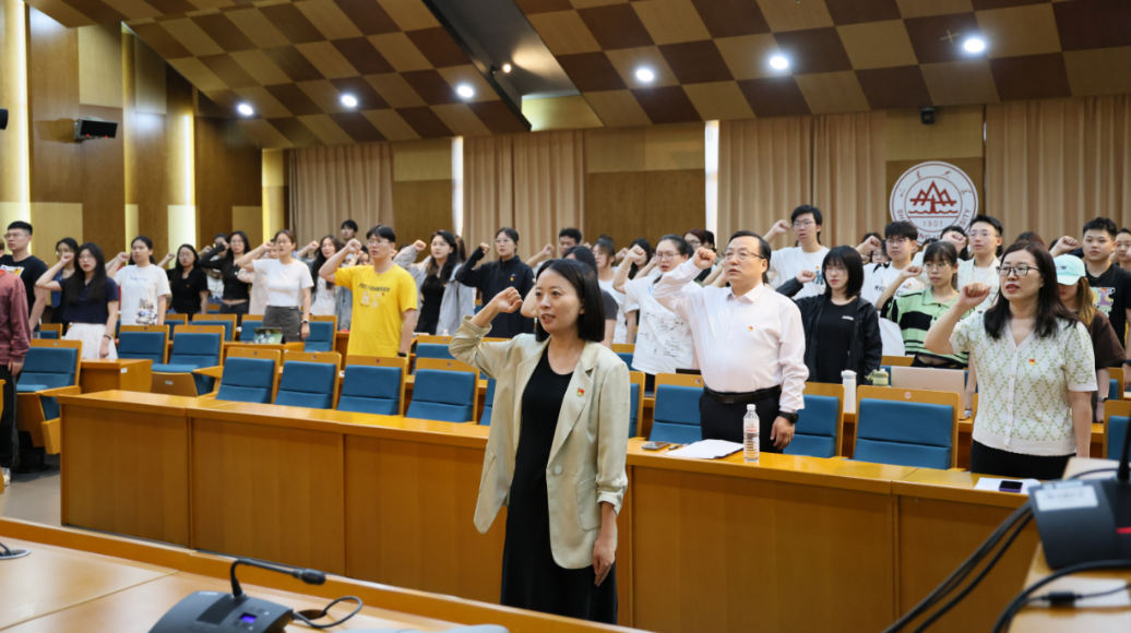 为庆祝中国共产党成立103周年,教育引导新发展党员铭记入党初心,强化党员意识,7月1日下午,TapTap在青岛校区华岗苑南楼五楼报告厅举行新党员入党宣誓大会。学院党委书记李海燕、党委副书记马桂兰、副院长赵婷、学生党支部书记、新党员及老党员代表参加会议。会议由学院党委副书记石莹主持。