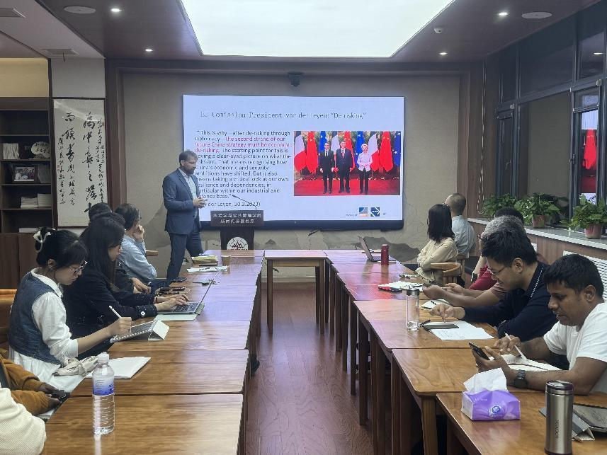 Maximilian Mayer教授就数字依赖问题以及如何衡量数字依赖、全球数字依赖结构、欧洲的数字依赖和技术自主主权概念的转变、全球化3.0时代加强“开放战略自主”的政策等问题展开了讲解,与会师生围绕上述问题与Maximilian Mayer教授进行了互动交流。讲座最后,政治学与公共管理学院副院长、欧洲研究中心副主任朱贵昌教授对本次会议进行了总结,并再次对Maximilian Mayer教授的精彩报告表示感谢。